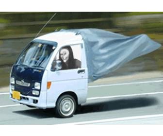 Tạo ảnh gif động của một chiếc xe tải đang bay với ảnh của bạn trong cửa sổ của chiếc xe tải mặc áo choàng siêu nhân.