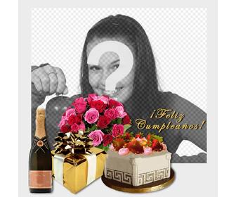 Tải ảnh với thiệp chúc mừng sinh nhật với quà tặng, hoa và bánh. Photoomontage trực tuyến để chia sẻ với gia đình và bạn bè của bạn.
